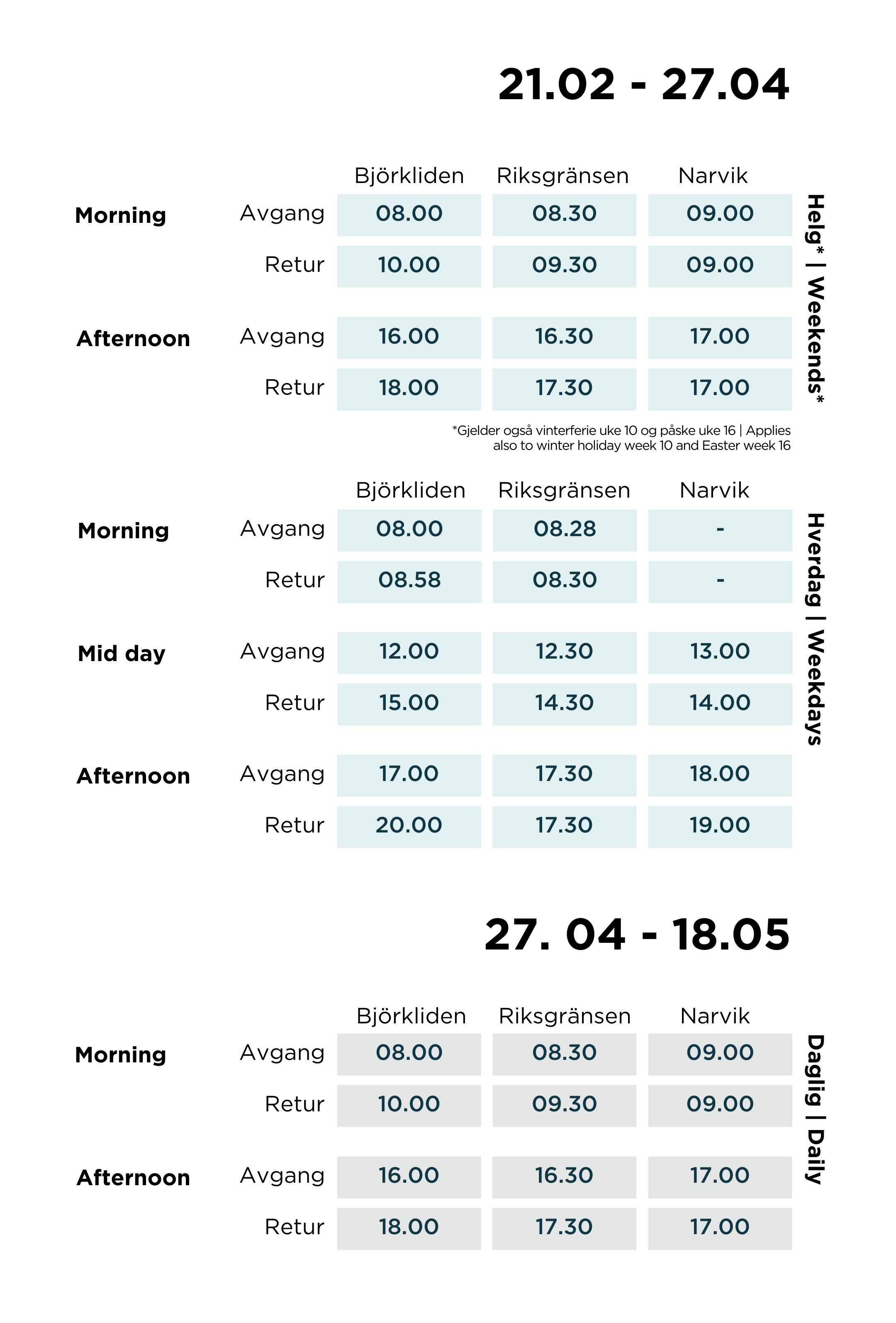 The Train departs Narvik at 10:25 every day during Easter, and returns from Bjørnfjell at 17:36 – ideal for a full day in the mountains. Book your ticket at www.sj.se. Just want to ride? The Arctic Train offers unforgettable roundtrip journeys on April 16 and 19.